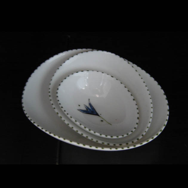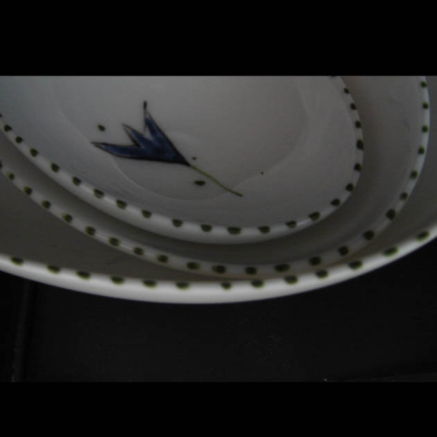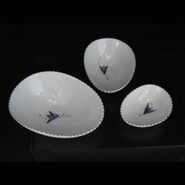 Jedes der drei Schälchen aus hauchdünnem Porzellan ist handbemalt, mit kleinen grünen Pünktchen und blauen Blüten, und das Motiv somit immer kleinen Veränderungen unterworfen. Die Malerei ist bei 850 Grad spülmaschinenfest eingebrannt. Die Schälchen, oval geformt in der Größe von ca 3 / 5 / 7 cm eignen sich für Dips oder kleine Nachspeisen und Leckereien.