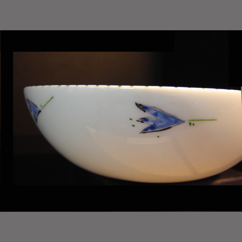 Schale aus fine bone china, handbemalt mit Blüten innen und umlaufend außen, am Rand mit grünen Pünktchen. Die Malerei ist bei 850 Grad spülmaschinenfest eingebrannt.