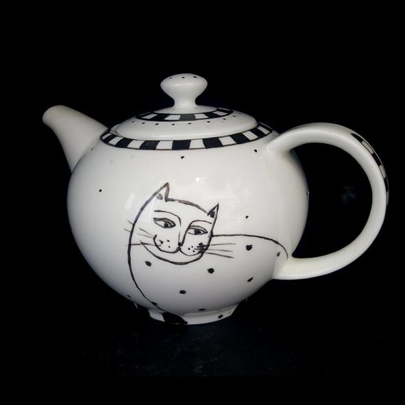 Jede Kanne ist handbemalt – kleine goldene Punkte springen um die Katze herum – das Motiv ist somit immer kleinen Veränderungen unterworfen.