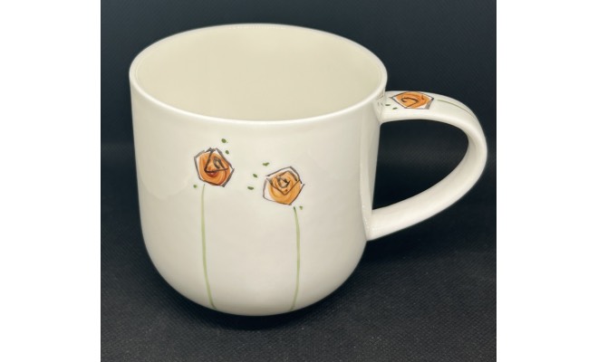 Großer, sehr leichter Henkelbecher aus Porzellan fine bone china, 0,35l, handbemalt mit kleinen roten Rosen. Das Motiv ist immer kleinen Veränderungen unterworfen. Die Malerei ist bei 850 Grad spülmaschinenfest eingebrannt. Tee, Kaffee, Glühwein … immer ein Genuss!