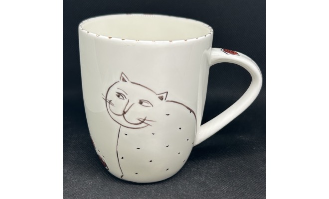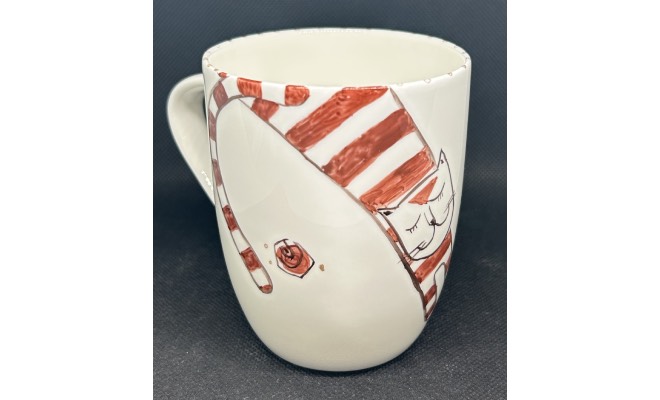 Mittlerer leichter Henkelbecher aus Porzellan fine bone china, 0,33 l, handbemalt mit springender Katze. Das Motiv ist immer kleinen Veränderungen unterworfen. Die Malerei ist bei 850 Grad spülmaschinenfest eingebrannt. Tee, Kaffee, Glühwein … immer ein Genuss!