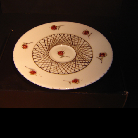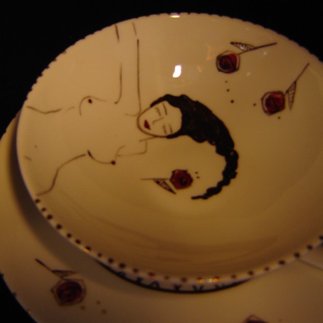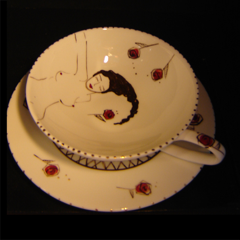 Gedeck (Tasse + Untertasse) aus fine bone china, formschöne flache Schale mit Henkel … auch für große Hände! … handbemalt und mit kleinen goldenen Pünktchen. Die Malerei ist bei 850 Grad spülmaschinenfest eingebrannt.