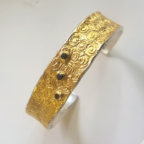 Dieser wunderbare Armreif wurde mit feinen Spiralen/Schnecken stilisiert und edle Highlights durch drei schwarze Dimanten gesetzt.