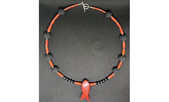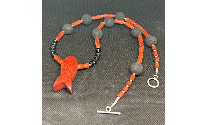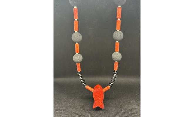 unikate Kette mit Koralle, Lava, Onyx, Silber 56 cm lang