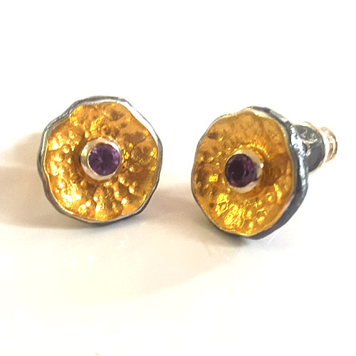 „gehämmerte Blüte – Amethyst“ Ohrstecker Silber teilgeschwärzt, teilvergoldet