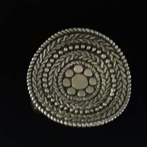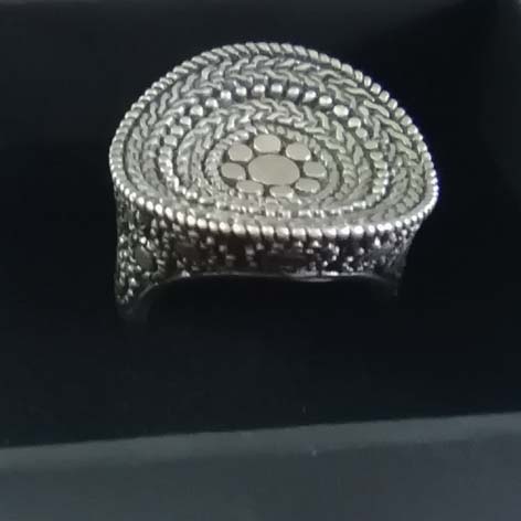 Durchmesser ca 2,5 cm … die leicht nach unten gewölbte Ringplatte „wächst“ förmlich aus der Ringschiene, das Stück lebt durch die filigranen Muster