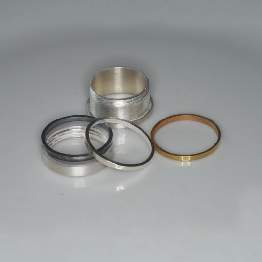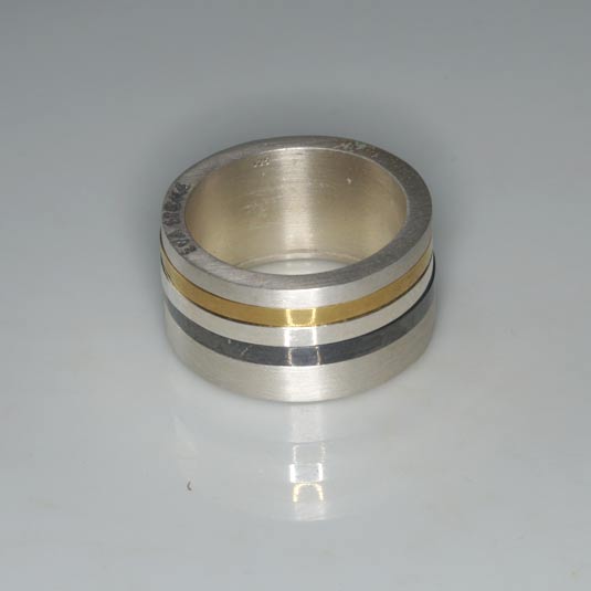 Die Reihenfolge der 3 schmalen Einzelringe (Silber, geschwärzt, vergoldet) kann jeder Träger beliebig selbst wählen.