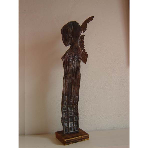 Skulptur aus Kiefernholz,gebrannt und gekalkt, sowie Eisenblech, gerostetes Fundstück